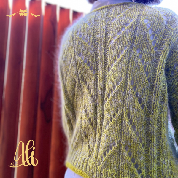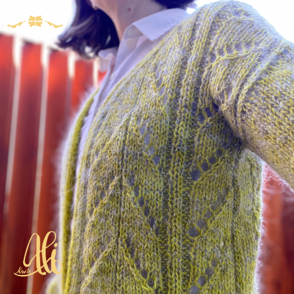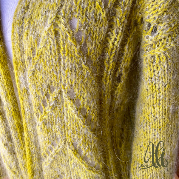 El cardi Chañar es una estructura bottom-up (de abajo hacia arriba) de hombros caídos, escote en V y un fit oversize. Lleva calados sencillos en todo el cuerpo y mantiene las mangas en punto jersey. Tejido con una hebra de merino fingering y mohair y aguja 7mm presenta un tejido entretenido y rápido. Como terminación lleva un i-cord todo alrededor del escote en V y borde inferior de la prenda y mangas.